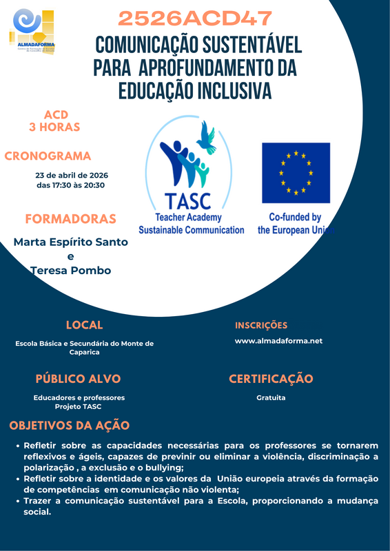 50 horas 28-04-2026 a 22-06-202625 vagas26 inscritosEscola Básica e Secundária do Monte de Caparica - EXCLUSIVA para DOCENTES DAS ESCOLAS DO CONCELHO DE ALMADA